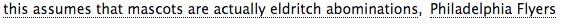 [Image Description: Tags reading “this assumes that mascots are actually eldritch abominations, Philadelphia Flyers”]