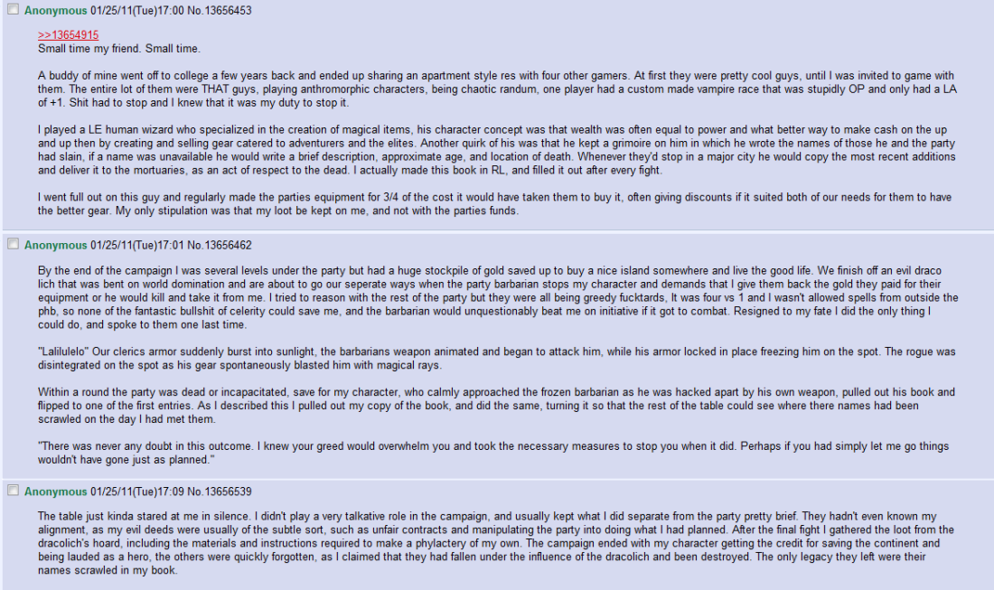 “… A buddy of mine went off to college a few years back and ended up sharing an apartment style res with four other gamers. At first they were pretty cool guys, until I was invited to game with them. The entire lot of them were THAT guys, playing anthromorphic characters, being chaotic randum, one player had a custom made vampire race that was stupidly OP and only had a LA of +1. Shit had to stop and I knew that it was my duty to stop it. I played a LE human wizard who specialized in the creation of magical items, his character concept was that wealth was often equal to power and what better way to make cash on the up and up then by creating and selling gear catered to adventurers and the elites. Another quirk of his was that he kept a grimoire on him in which he wrote the names of those he and the party had slain, if a name was unavailable he would write a brief description, approximate age, and location of death. Whenever they’d stop in a major city he would copy the most recent additions and deliver it to the mortuaries, as an act of respect to the dead. I actually made this book in RL, and filled it out after every fight.I went full out on this guy and regularly made the parties equipment for ¾ of the cost it would have taken them to buy it, often giving discounts if it suited both of our needs for them to have the better gear.